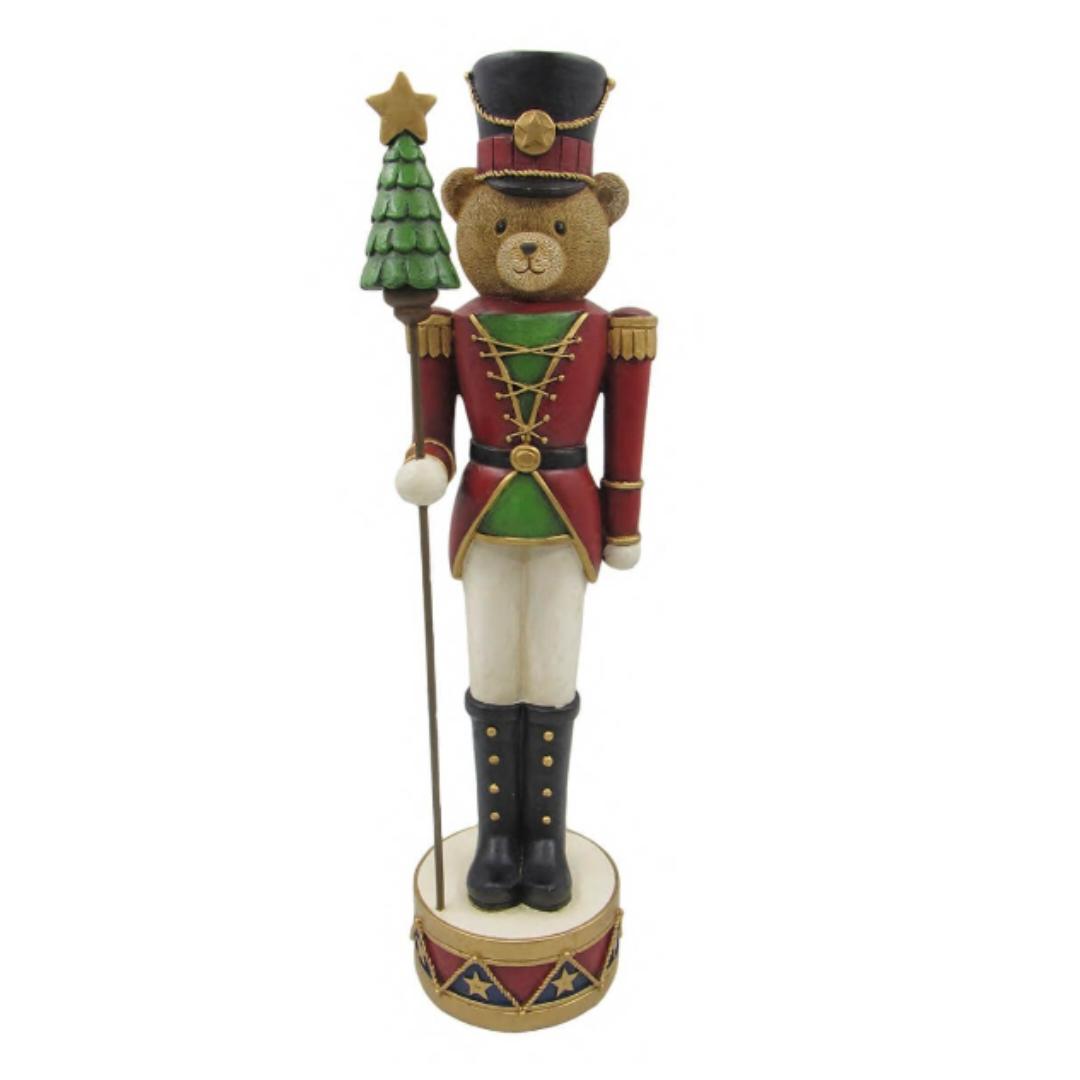 This resin bear nutcracker ornament showcases a bear dressed in a festive red, green, and black uniform, holding a green tree topped with a yellow star. Standing on a round, decorated base, this detailed piece blends classic nutcracker design with charming woodland elements, making it a refined addition to holiday décor or collectible displays.