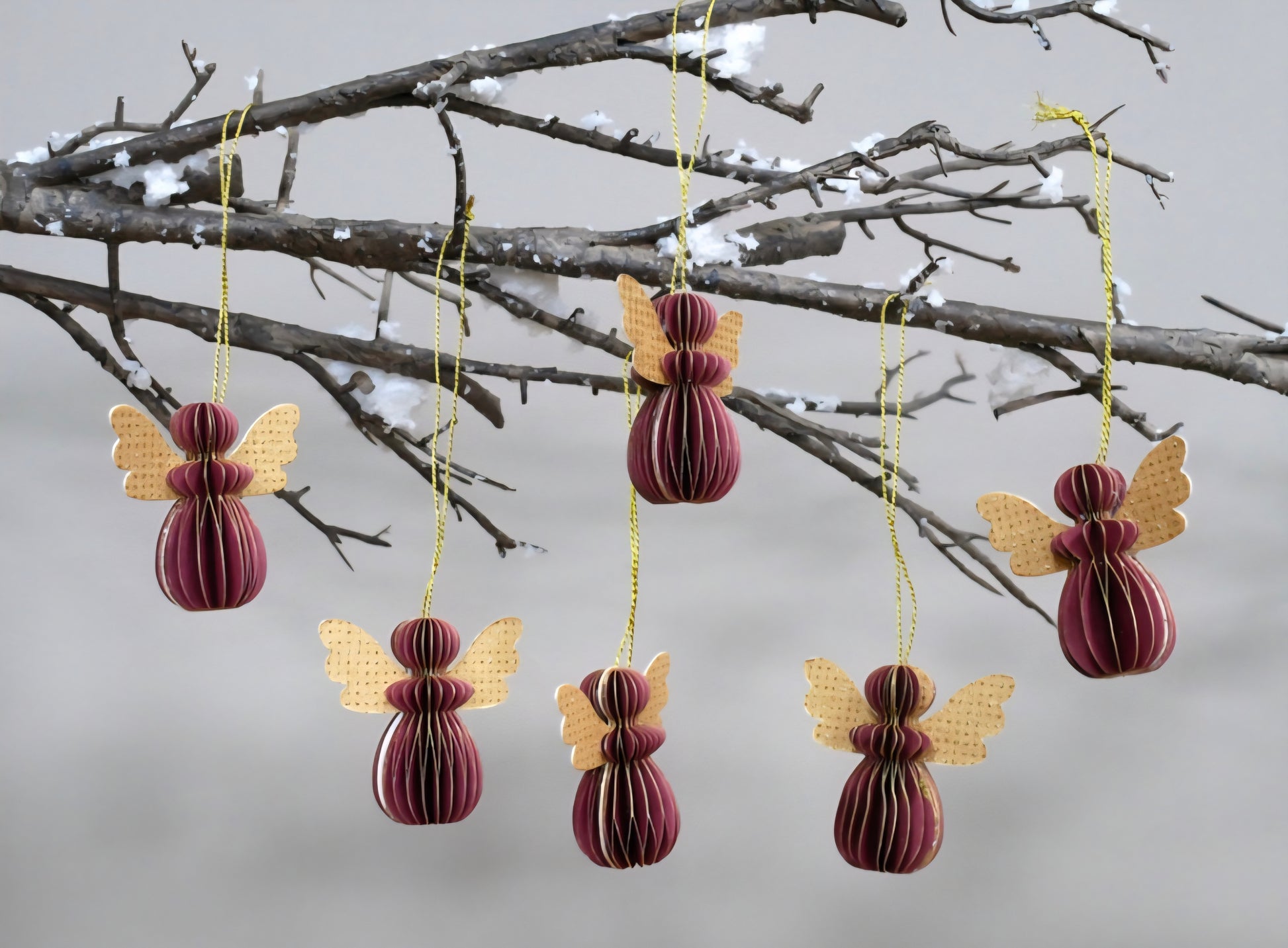 These hand-crafted set of 6 tree angels in deep red bring a timeless elegance to your holiday décor. Each angel is meticulously made, showcasing expert craftsmanship and rich, vibrant colour that adds warmth to any festive setting. Perfect for adorning your Christmas tree or creating a refined seasonal display, they combine tradition with artistic detail for a truly special ornament.